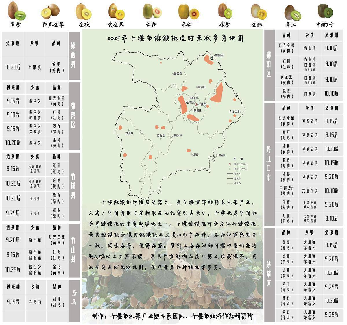 湖北日报讯(记者崔逾瑜、通讯员胡光明、肖涛)甜甜“猕猕”,又至金果飘香季。日前,十堰市水果产业链专家团队牵头制定并发布了《2025年十堰猕猴桃适时采收参考地图》,旨在引导果农和收购企业科学采收猕猴桃,保障果品品质,推动地方特色产业持续健康发展。该地图结合十堰不同产区气候条件和品种特性,明确了主要猕猴桃品种的适宜采收期,绘制了直观的“采收参考地图”,为消费者和种植主体提供了重要依据。